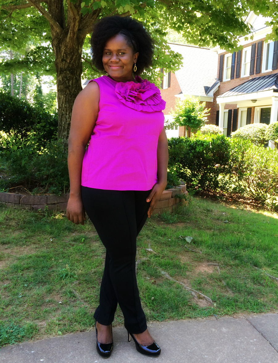 How are you darlings? How is the heat treating you so far? I think we will hit 90 degrees today. But the temperature was cooler when we got these pictures taken. There is something exciting about warmer weather! I love wearing bright colors during the summer. I like how happy they make me feel in general. But I tend to wear more dark colors during fall and winter, like most of us do. Before retiring my black pants and closed toe shoes until Fall, I decided to pair this top with those black pants to make the color pop a little more. The top has a full zipper in the back, and the ruffles definitely make it stand out. I kept my yellow earrings on, and completed the look with my black pumps. I was not going for a full color block look, but it all worked out. Let me know what you think below.