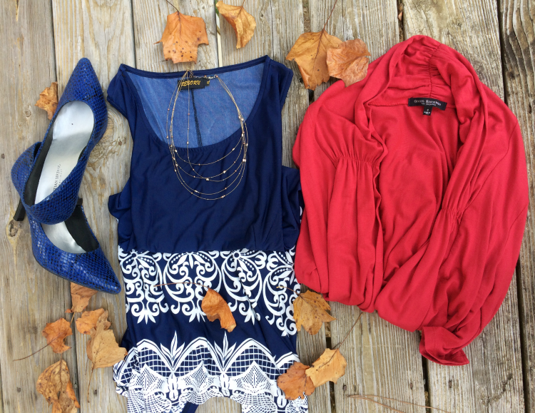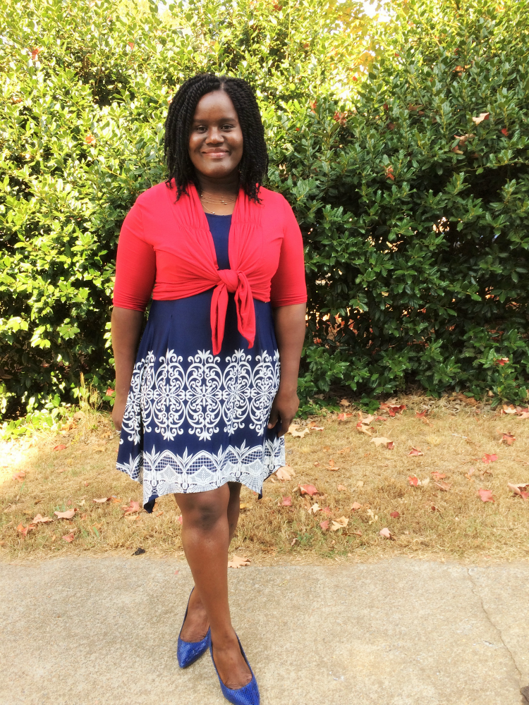 My style changes from season to season. Have you been enjoying the fall season? We are still enjoying temperatures where a simple dress and a cardi is okay. I have become such a big fan of asymmetrical fashion pieces. I think the last time I wore one was last fall. After I bought this dress, all I could think about was some comfortable dancing shoes. But my kitty heels did the trick. I love the highs and the lows that reminds me of how unpredictable life can be. This dress also reminds me of the song, ” I hope you dance.” But don’t let it fool you, the wind blowing in the wrong direction almost revealed all my business. I love the design nonetheless. I threw a cardigan over the dress to complete the red, white, and blue look. What do you think?