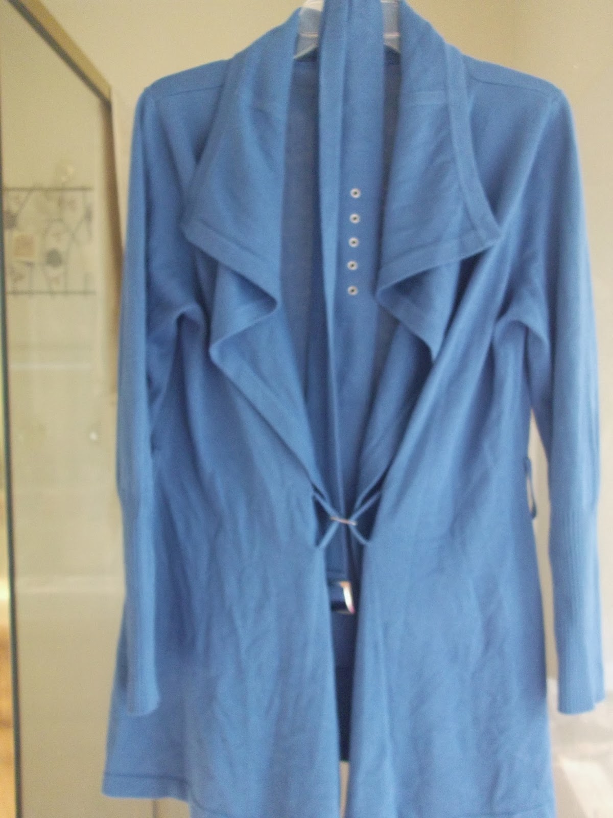 I love the drapey neck on this sweater. It comes with a belt, which I really love.